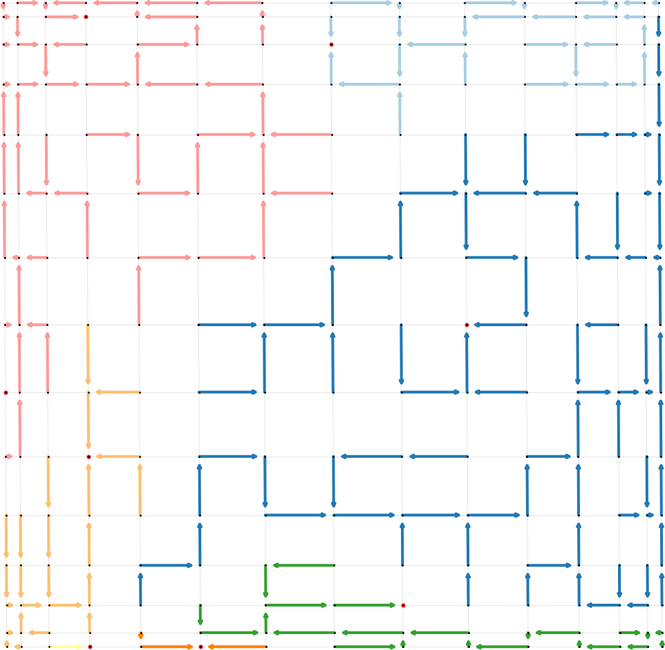 \[\mathbb{P}(\Phi_q = \phi) = \frac{w(\phi) q^{|\mathcal{R}(q)|}}{Z(q)}\]where $\mathcal{R}(\phi)$ is the set of roots of the trees in the forest. The root vertices are such that, given any other vertex in the tree, following the directed edges in the tree you always reach the root. The quantity $Z(q)$ is a partition function and sums the numerator over all possible random spanning forests (denoted by the set $\mathcal{F}$)