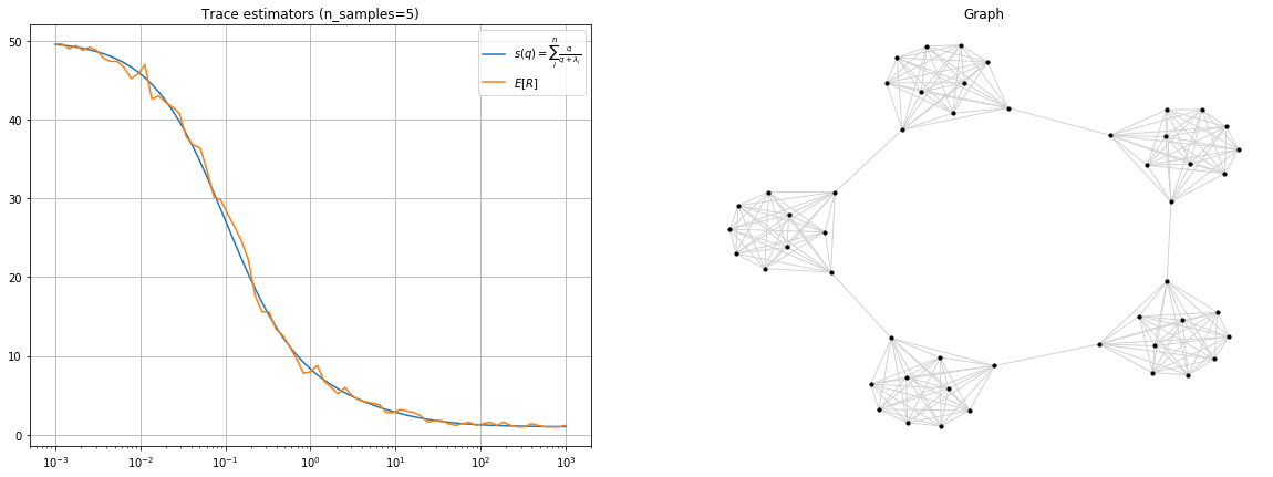 \[\mathbb{E}[|\mathcal{R}_q(\phi)|] = q\mathrm{Tr}\left \lbrack \left( q\mathbf{I} + \mathbf{L} \right)^{-1} \right \rbrack\]For example, for the ring of cliques graph shown in the picture below and only 2 random samples we have a very good approximation of $q\mathrm{Tr}\left \lbrack \left( q\mathbf{I} + \mathbf{L} \right)^{-1} \right \rbrack$ by using the average number of roots.
