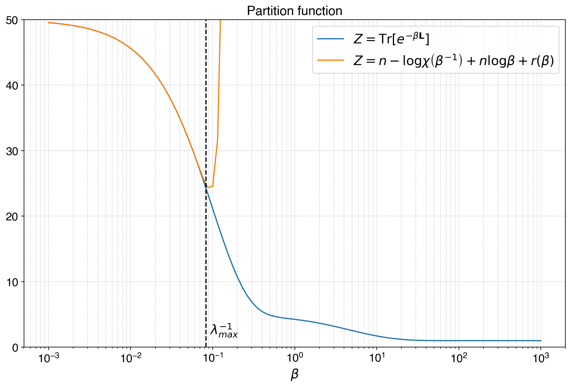 \[\log \chi(q) = \mathrm{Tr}\lbrack \log(q\mathbf{I} + \mathbf{L}) \rbrack\]With some other simple manipulations and setting $q=\beta^{-1}$ we obtain: